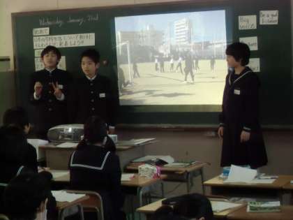 写真は、1グループが前に出て学校生活を外国の人に伝わるかどうか、説明しているところです。アシュリー先生がどれだけ分かったか回答します。私は国語の教師ですが、今日の二人の英語の授業を見ていて、自分が習った40年前より、よほど英語が授業の中で使われています。あいさつだけでなく、先生の指示やアシュリー先生の感想も簡単とはいえ、英語なんです。勉強になります。