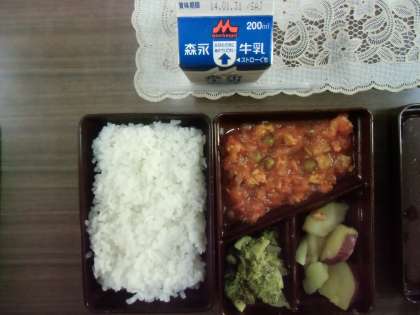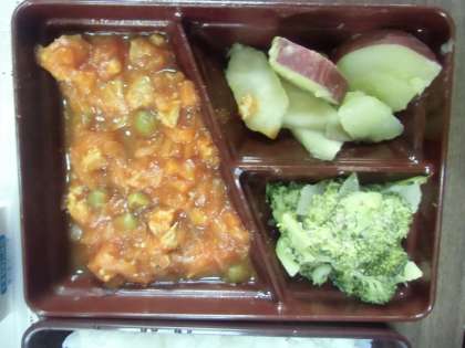 今日の給食は、セルフチキンライス、アップルポテト、ブロッコリーのごまあえでした。ちなみに、私は「セルフチキンライス」と知らずに、ケチャップの部分とごはんを別々に食べてしまいました。