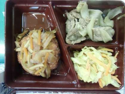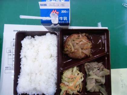 今日の給食は、豆腐ハンバーグの野菜ソースかけ、豚肉のしょうが炒め、キャベツの和え物でした。