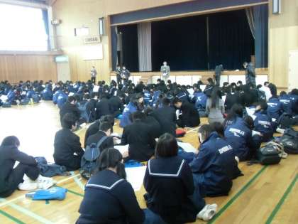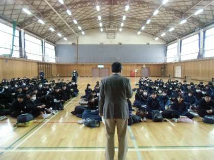 2月7日(金)放課後、3年生の私立高校、専修学校を受験する生徒が体育館に集まり、2月10日(月)に向けての注意を聞きました。全員、緊張した顔で聞いていました。