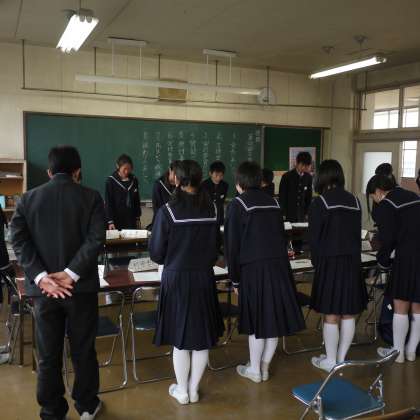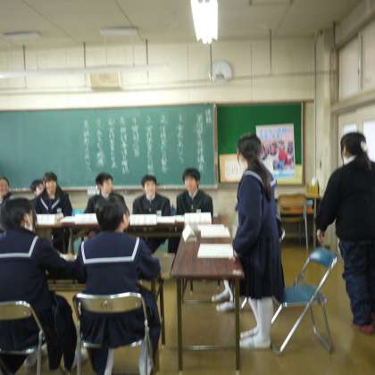生徒評議会の様子です。各委員会からの報告が終わると、質疑応答です。美化委員会へ、美化アンケートの結果について質問がありました。回答として、清掃プロジェクトを今後(来年度?)考えているということでした。校風委員会には、特別教室への移動のとき、校風委員が教室の鍵をしめるのだが、なかなか教室を出てくれない人がいて困っているとの質問がありました。回答には、いろいろ苦心?の対策をしていることが報告されました。(校風委員さん、ほんとにごくろうさん!!)生徒会役員には住中BOXについていくつか質問がありました。会長から「僕は、どんな意見が入っているか、ものすごく気になるので、毎日見ています。」と回答がありました。