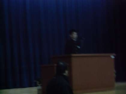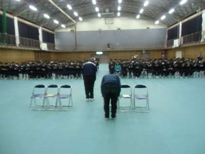 来週月曜日には卒業式の予行があります。ということで、今日の練習では、送辞を読む人も壇上に上がって礼のあいさつをしました。2枚目の写真は、竹中先生が3年担任の役をやり、高井先生が3年生徒の役をやっています。学年主任の山本先生は校長先生の役もしていました。