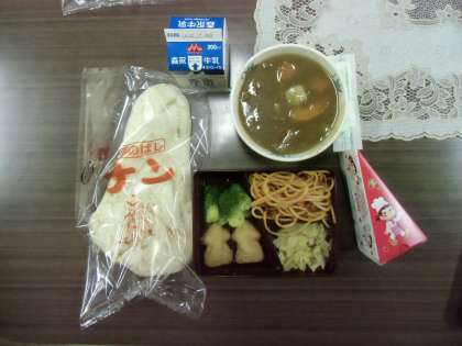 今日はなななんとショートケーキが出ましたよ。返却時に生徒に聞くと、みんな「おいしかたです」とのこと。それと「ナン」も出ました。少し冷たかったでけど、おいしく食べました。