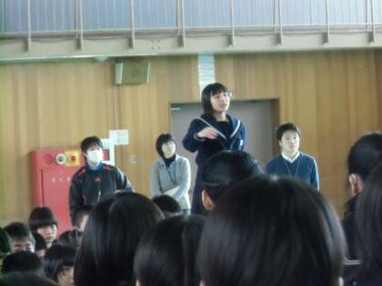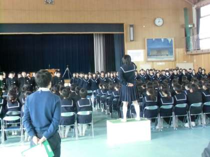 卒業の歌「旅立ちの日に」を歌っているところです。この歌は当日は泣いてる人が多く、あまり声は出ないかもしれませんね。今日の校歌はものすごく声が出ていました。びっくりしました。すばらしい。