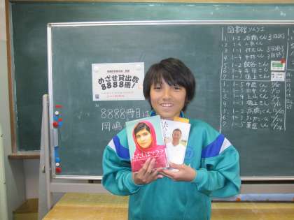 今日は卒業式の前日なので、図書館のそうじに来てくれていた1年生の人が、帰るときに借りた本が8888冊目だったのです。