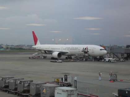 搭乗手続きを済ませ、搭乗口で待ちます。乗るのはJALです。