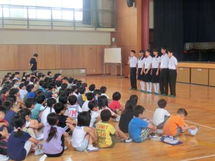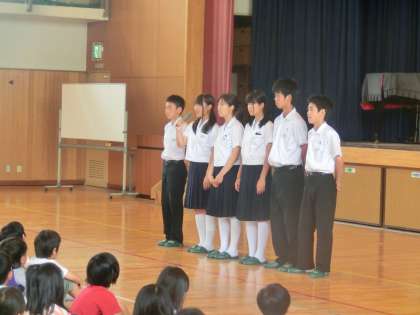 生徒会では今月から毎週水曜日の朝、住道南小学校に出前あいさつ運動に行くことになりました。今日は、児童集会に参加して、そのことを子どもたちに伝えました。これからも、小学校と中学校の連携をもっと深めていきたいと思います。