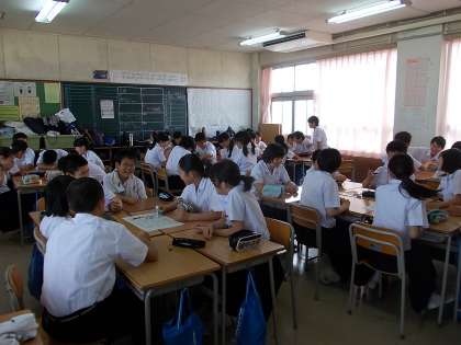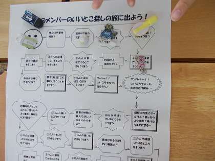 1年生は班のメンバーのいいとこ探しをしています。双六の要領で支持された内容に従い、楽しくお互いの交流をしています。