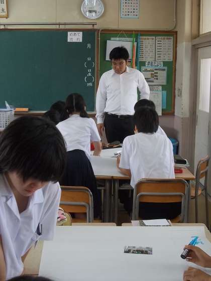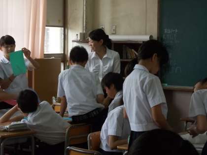 教育実習の先生も加わり、2年生は林間学舎の写真を班ごとに発表できるようにしています。