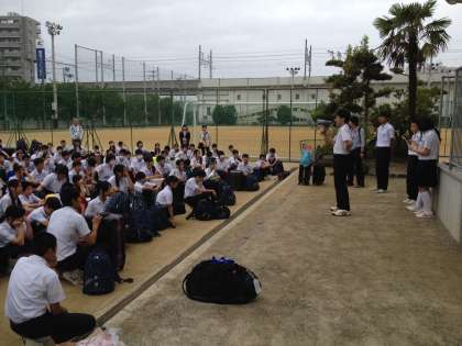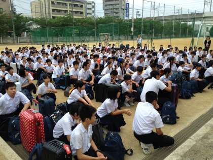 おはようございます。雨がぱらつく天候ですが、予定通り、テニスコートで出発式を行いました。今日からの二泊三日の修学旅行で、たくさんの思い出を作ってきます。