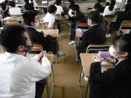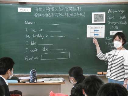 明日から正式に今年度の時間割りがスタートします。写真は2年生の英語の授業の様子です。楽しそうにペア学習を行っていました。