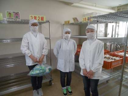 今日のメニューは、黒糖パン、じゃがいものインド風煮、バジルチキン、キャベツとハムのサラダ、ミルメーク、牛乳です。いつも温かい給食を提供してくれている配膳員さんです。6名の方がローテーションを組んで関わってくださっています。これからもよろしくお願いします。