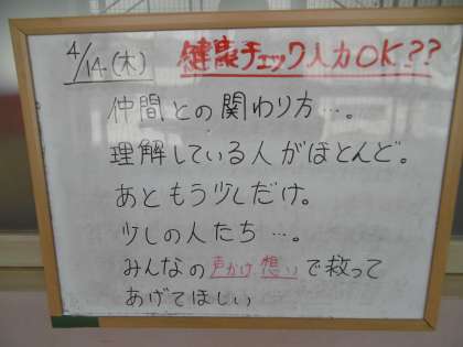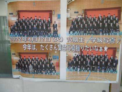 毎朝、学年の先生からのメッセージが書かれています。火曜日に撮った学級写真が大きく掲示されていました。1年間クラスの仲間と仲良く過ごしましょう。