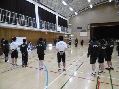 体育館でバドミントン部が部長のしっかりとした指示のもと、練習をしていました。女子バスケットボール部、バレー部、剣道部が本日公式戦です。