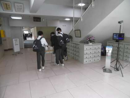 元気よくあいさつをしてくれる生徒が今日もたくさんいました。職員玄関に検温用のサーモグラフィー(生徒は毎朝自宅で検温し、タブレットで結果を送信)と手指消毒用の消毒液を用意しています。