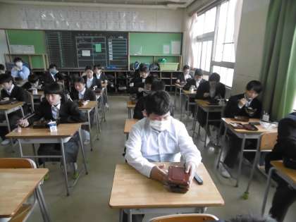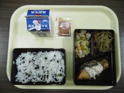 今日のメニューは、わかめごはん、鮭のマヨネーズ焼き、しゃぶしゃぶ風サラダ、きんぴらごぼう、ごまドレッシング、牛乳です。どのクラスも黙食、継続中です。本当に静かに食べています。