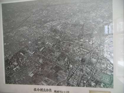 写真は職員玄関に飾られている昭和52年11月22日に撮影された住道中学校区の航空写真です。歴史を感じます。