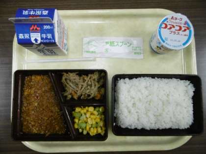 今日のメニューは、白ごはん、ドライカレー、ごぼうサラダ、枝豆コーン、ヨーグルト、牛乳です。今日は北条中学校の栄養教諭の先生が、本校に巡回指導(給食指導)に来られています。栄養教諭の先生は本校の全学年に食育の授業を行う予定になっています。