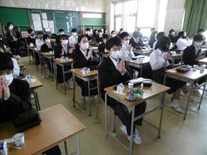 昼食中に各教室を回っていると、1年1組でちょうど「いただきます!」をしていました。全員の動きが揃っていて、見事でした。