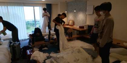 朝食会場に向かう前に、部屋を片付けています。