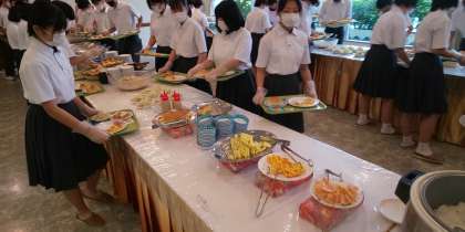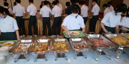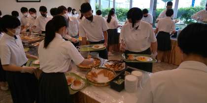 朝食はブュッフェ形式です。昨日に引き続き、両手に手袋をつけて各自で料理を取り皿に取っています。