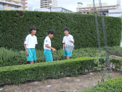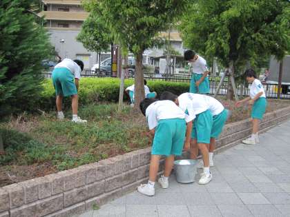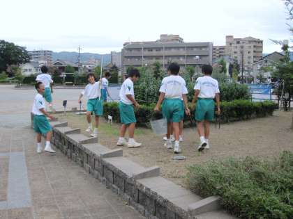放課後、男子ソフトテニス部が地域ボランティア清掃に取り組み、末広公園を中心にゴミ拾いをしました。