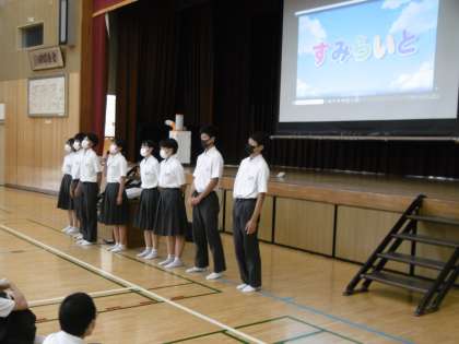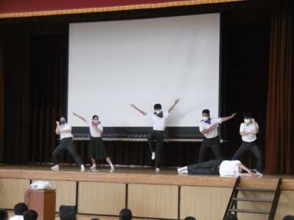 昨日に引き続き、今日も生徒集会が行われました。3年委員長会からは映像を交えて卒業まで「愛し、愛される学年をめざします」との発表がありました。生徒会からは寸劇を交えて「住道中学校はみんながリーダー」というメッセージがありました。全校生徒にとってとても素敵な時間になりました。3年委員長会の皆さん、生徒会役員の皆さん、素敵な発表を本当にありがとう。3枚目の写真はいつも集会や朝礼の準備を完璧にしてくれる本校の放送部員です。