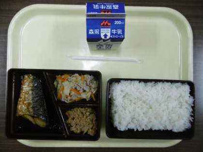 今日のメニューは、白ごはん、鯖の生姜煮、野菜炒め、ツナ大豆ふりかけ、牛乳です。