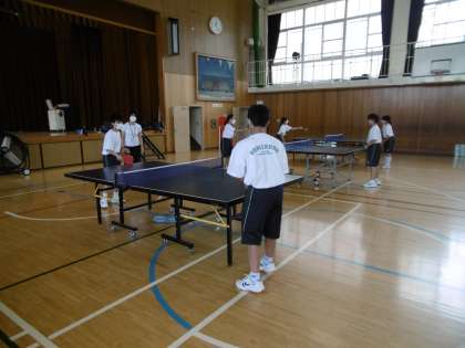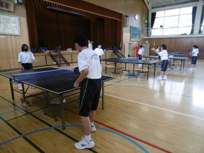 卓球部が午後から体育館でがんばって練習をしていました。顧問の先生も一生懸命です。