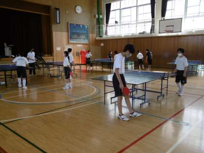 体育館の男子バスケットボール部と卓球部の様子です。卓球部では先生が生徒と一緒に練習をしていました。