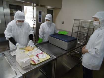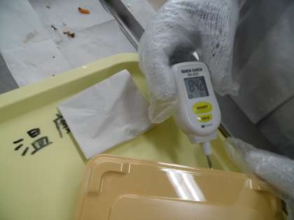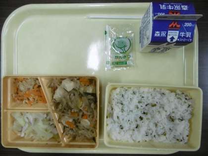 今日のメニューは、菜めし、豆腐のチャンプル、キャベツとハムのサラダ、ゆずドレッシング、にんじんしりしり、牛乳です。今日は配膳室で検温に立ち会うことができました。毎日配膳員さんが給食を75度以上になるように温めてくれています。今日の温度は84.2度でした。配膳員さん、いつも子どもたちのためにありがとうございます。