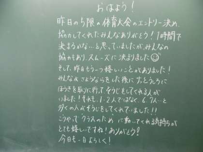 1年生の先生がすでに教室に来て、窓を開け、一日の準備をしていました。その時に書かれた黒板メッセージです。