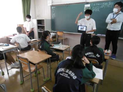 3年4組の英語の授業です。授業のねらいは「お勧めの映画を魅力たっぷりに紹介できる」でした。タブレットパソコンを使って、流暢な英語で映画紹介をしていました。発表者が笑顔でプレゼンを行っていることに感心しました。
