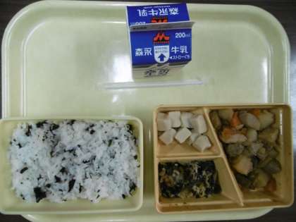 今日のメニューは、わかめごはん、炒り鶏煮、ほうれん草とツナの和え物、高野豆腐の含め煮、牛乳です。