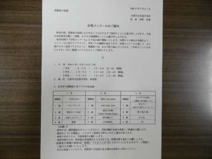 合唱コンクールで歌う曲のパート別練習をしていました。合唱コンクールは10月26日(水)に行われます。本日の終学活で詳しい内容を記載した案内プリントを配布しています。
