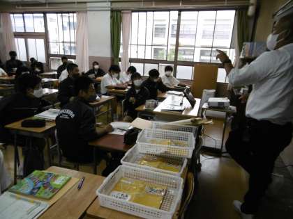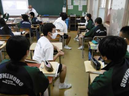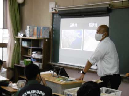 写真は2年4組の社会です。三角州と扇状地の違いを写真を見て説明するという授業でした。発表している男子生徒の態度が立派でした。