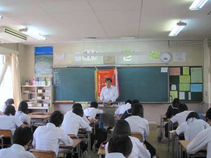 担任・嘉屋先生の後ろ、黒板には体育大会の優勝旗が掲示されています。