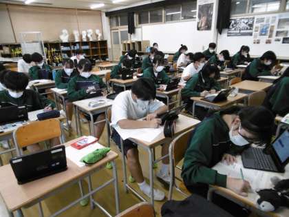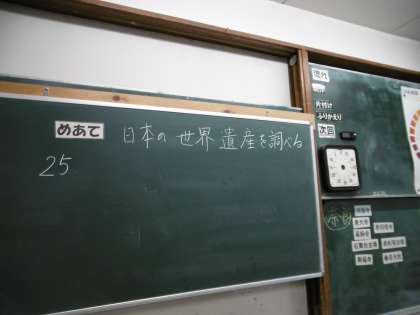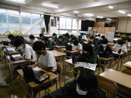 写真は2年3組の美術です。タブレットパソコンを使って、日本の世界遺産について各自で調べ学習をしていました。授業は本当に静かでした。