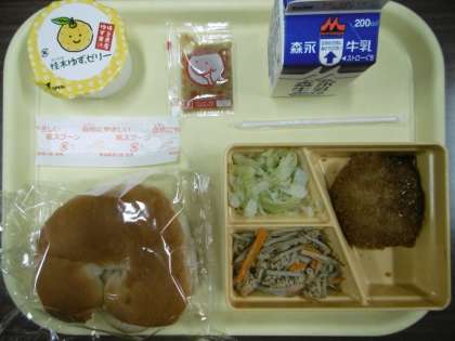今日のメニューは、バーガーパン、ミンチカツソースかけ、ごぼうサラダ、ごまドレッシング、キャベツソテー、ゆずゼリー、牛乳です。