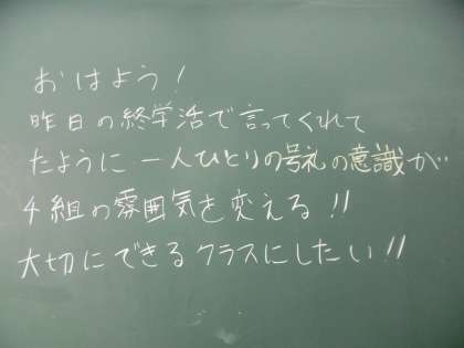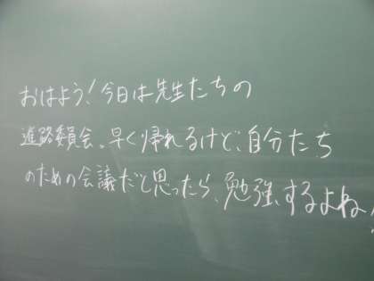 3年生の担任の先生からの熱いメッセージです。生徒が登校する前に、それぞれの担任の先生は教室に上がり、登校前の教室整備を毎朝、欠かさずしています。