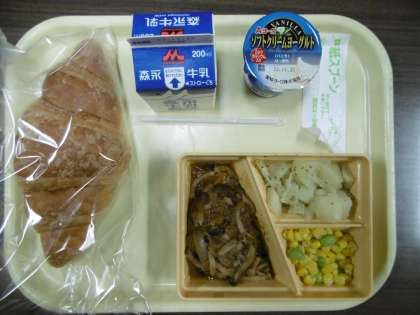 今日のメニューは、クロワッサン、デミグラスハンバーグ、ジャーマンポテト、枝豆コーン、ソフトクリームヨーグルト、牛乳です。