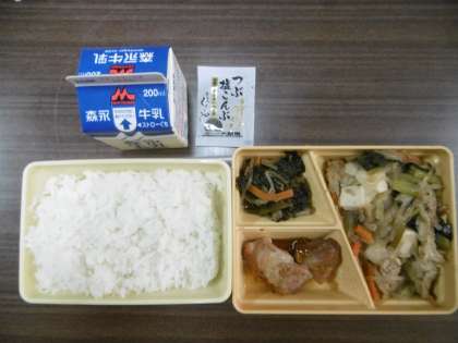 今日のメニューは、白ごはん、豆腐のチャンプル、鶏肉の照り焼き、ほうれん草ともやしのかつお和え、塩こんぶ、牛乳です。