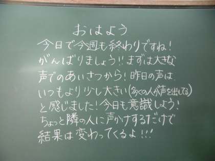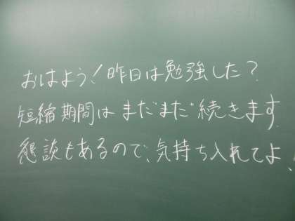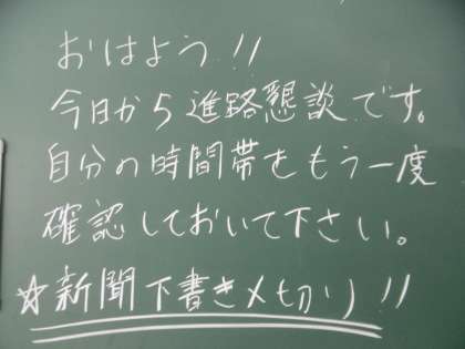 今朝の黒板に書かれていたメッセージです。今日から進路懇談が始まります。卒業後の進路に向けての話し合いや確認の場となります。よろしくお願いいたします。