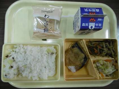 今日の給食は、さつまいもごはん、鯖の大根おろしかけ、茎わかめ入りきんぴら、野菜炒め、わらびもち、牛乳です。