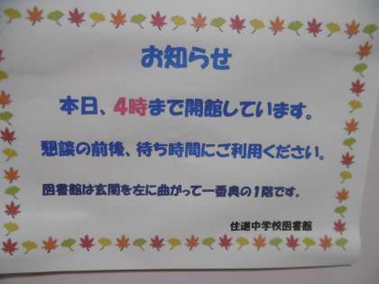 午後からの二者懇談(1・2年)や三者懇談(3年)で立ち寄ってみませんか? 親子で読書ができる図書館をめざしています。