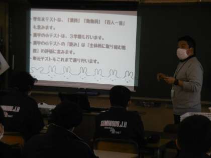3学期最初の授業ということもあり、評価や授業内容について大変丁寧なガイダンスが行われていました。先生の話を聞いている生徒も真剣そのものです。4月から最上級生になる自覚を感じることができました。75期生に大いに期待しています。