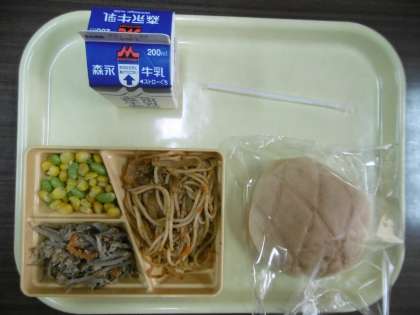 今日のメニューは、メロンパン、スパゲティミートソース、ごぼうサラダ、ごまドレッシング、枝豆コーン、牛乳です。