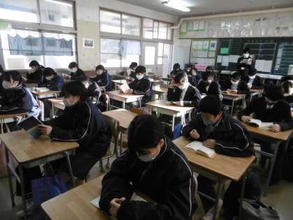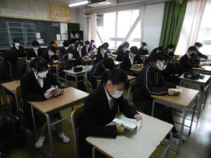 「継続は力なり」です。やるべきこと、当たり前のことを今日も継続して全校で取り組みました。写真は上から3年3組、2年2組、1年4組です。