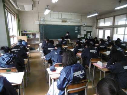 教材「故郷」の範読(教師が読み方の手本として生徒に読んで聞かせること)をしているところです。今日は1回目ということもありラジカセを使用しましたが、子どもたちは本当に静かにラジカセから流れる音声を聞いていました。