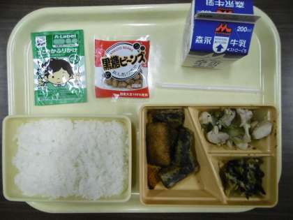 今日のメニューは、白ごはん、いわしのしょうがだれ、鶏のゆずこしょう炒め、小松菜とツナの和え物、ふりかけ、黒糖ビーンズ、牛乳です。